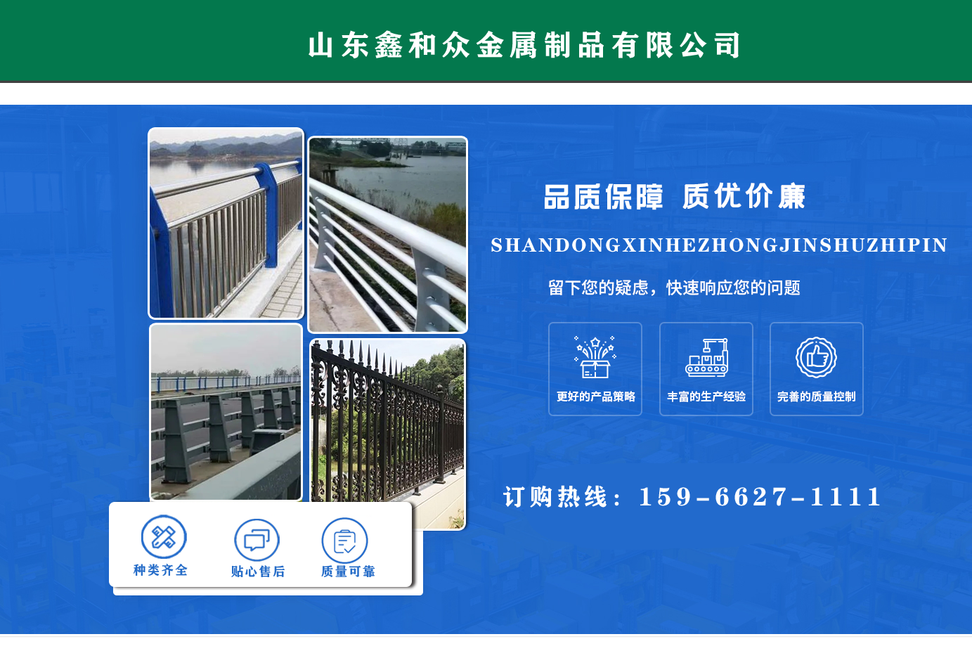 山東鑫和眾金屬制品有限公司主要產(chǎn)品有防撞護(hù)欄,橋梁護(hù)欄,道路護(hù)欄,河道護(hù)欄,不銹鋼護(hù)欄等護(hù)欄。提供設(shè)計方案,一站式定制,包您滿意價格優(yōu)惠,歡迎來電咨詢! 公司常年從事銷售護(hù)欄防撞護(hù)欄,橋梁護(hù)欄,道路護(hù)欄,河道護(hù)欄,不銹鋼護(hù)欄,橋梁鋼護(hù)欄,河道燈光護(hù)欄等。產(chǎn)品廣泛應(yīng)用于橋梁、河道、旅游景區(qū)、道路、公路、公園、小區(qū)、景觀、道路防撞等領(lǐng)域。 公司產(chǎn)品均采用優(yōu)質(zhì)不銹鋼材料,符合相關(guān)標(biāo)準(zhǔn)。各種型號不銹鋼復(fù)合管及護(hù)欄,質(zhì)量嚴(yán)格把控。產(chǎn)品強(qiáng)度高、耐腐蝕、焊接牢固、抗沖擊、性能好,防撞護(hù)欄結(jié)構(gòu)簡單、美觀實用大方?! g迎前來訂購!...